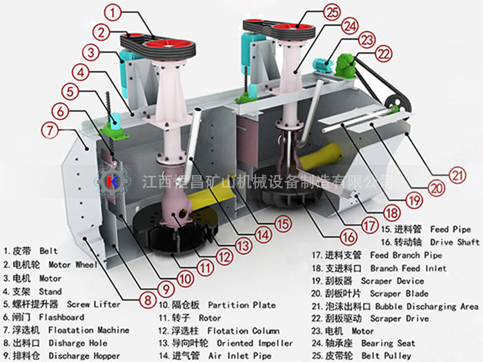 機械式攪拌浮選機設(shè)備主要由轉(zhuǎn)子、導向葉輪、隔倉板、刮板器、刮板驅(qū)動等部分組成。